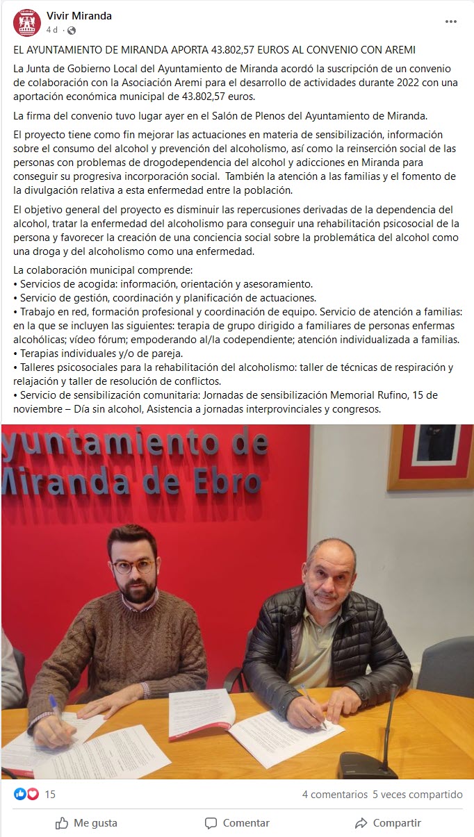 2007 El Correo - Presentación programa empresas 2007 EL Correo - Aremi apuesta por mantener una «actitud luchadora» para salir del alcoholismo 2007 El Correo - Aremi alerta sobre el gran incremento del consumo de alcohol en Nochevieja 2007 Diario de Burgos - Entrevista a Angel Velasco (Presidente de FARE)