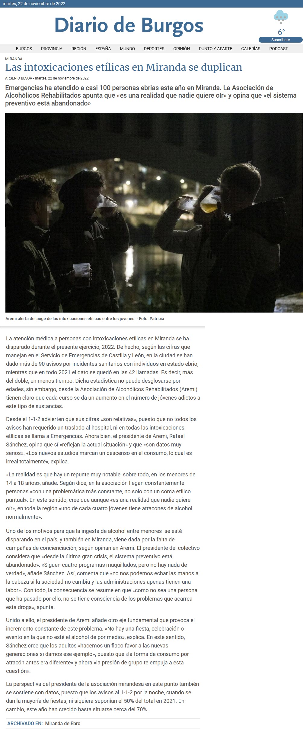 2011 El Correo - Un centenar de personas recurren a Aremi al año 2011 Blog Prevención - 25 aniversario de AREMI 2011 La Voz del Ebro - Jornadas de prevención 2011 Diario de Burgos - Actores de estreno 2011 El Correo - Miranda se mueve contra el alcohlismo 2011 El Correo - Entrega del León de Oro a AREMI (25 Aniversario) 2011 El Correo - Memorial Rufino - Grupo de Teatro AREMI 2011 Diario de Burgos - Crece hasta el 25% el número de mujeres atendidas por Aremi 2011 Diario de Burgos - Aremi tutela un grupo terapéutico para alcohólicos en Briviesca