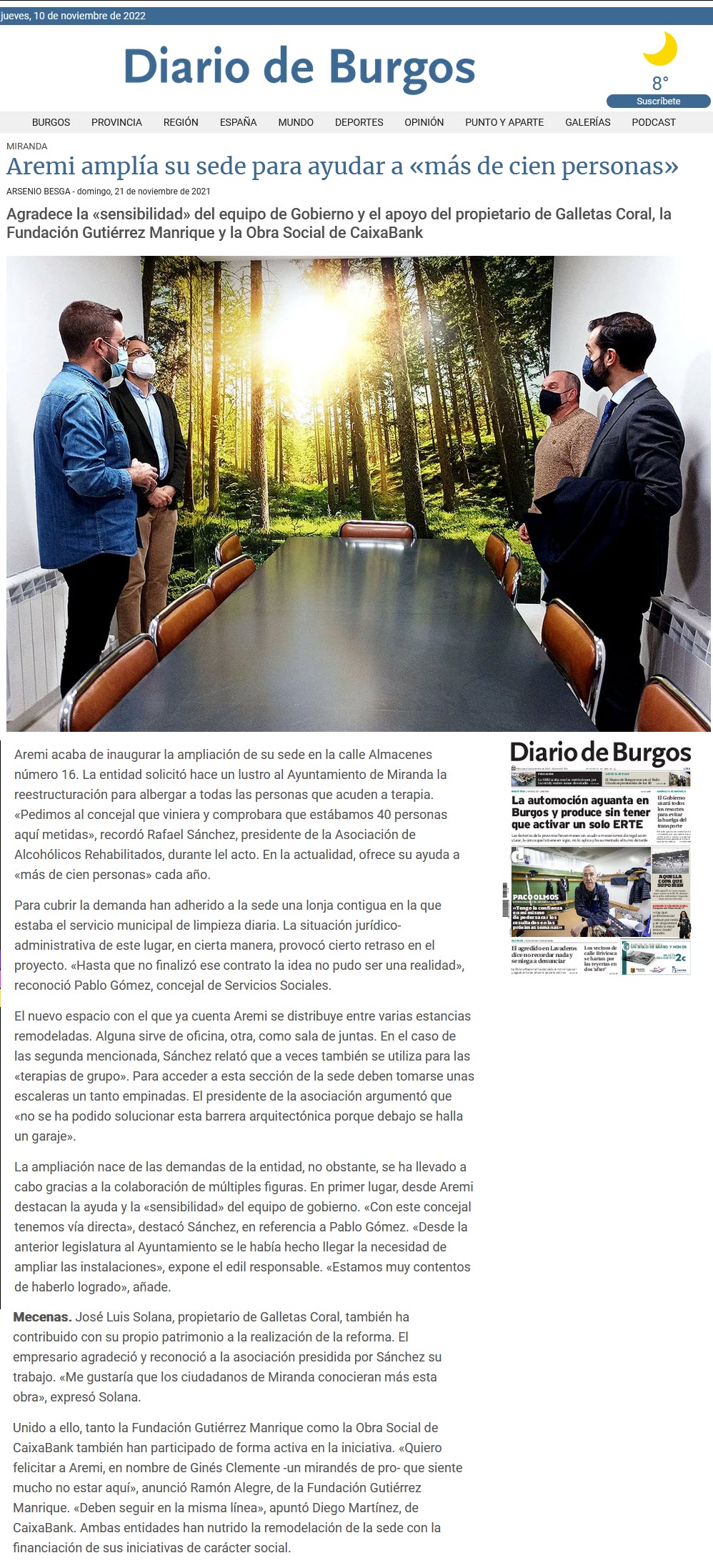 2021 - Miranda FM - Entrevista Memorial Rufino (jpg) 2021 - El Correo (16/11/2021) - Portada con AREMI (jpg) 2021 - El Correo (16/11/2021) - Artículo Inauguración Sede y Memorial Rufino (link) 2021 - El Correo (16/11/2021) - Artículo Inauguración Sede y Memorial Rufino (jpg) 2021 - El Correo (16/11/2021) - Artículo Inauguración Sede y Memorial Rufino (PDF) 2021 - La de Miranda TV (15/11/2021) - Inauguración de la Nueva Sede (link) 2021 - La de Miranda TV (15/11/2021) - Inauguración de la Nueva Sede (PDF) 2021 - La de Miranda TV (15/11/2021) - Video Inauguración de la Nueva Sede (link a video) 2021 - Diario de Burgos (10/11/2021) - Inauguración de la Nueva Sede (jpg) 2021 - Diario de Burgos (10/11/2021) - Inauguración de la Nueva Sede (link) 2021 - El Correo (15/09/2021) - Artículo Ampliación Sede (jpg) 2021 - El Correo (15/09/2021) - Artículo Ampliación Sede (link) 2021 - El Correo (09/08/2021) - Artículo Juego (PDF) 2021 - El Correo (09/08/2021) - Artículo Juego (jpg) 2021 - El Correo (07/06/2021) - Artículo (jpg) 2021 - El Correo (27/04/2021) - Artículo (jpg) 2021 - La de Miranda TV (17/03/2021) - Cesión de local a AREMI (link) 2021 - La de Miranda TV (17/03/2021) - Cesión de local a AREMI (PDF) 2021 - La de Miranda TV (04/034/2021) - Artículo sobre AREMI (link) 2021 - La de Miranda TV (04/03/2021) - Artículo sobre AREMI (PDF)