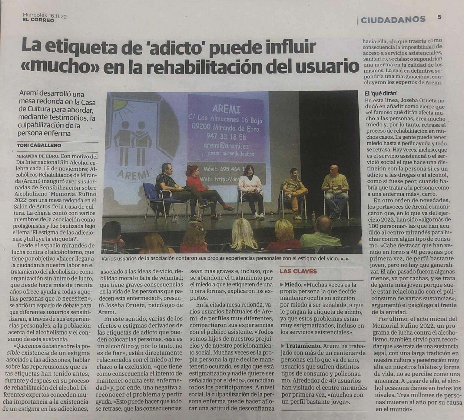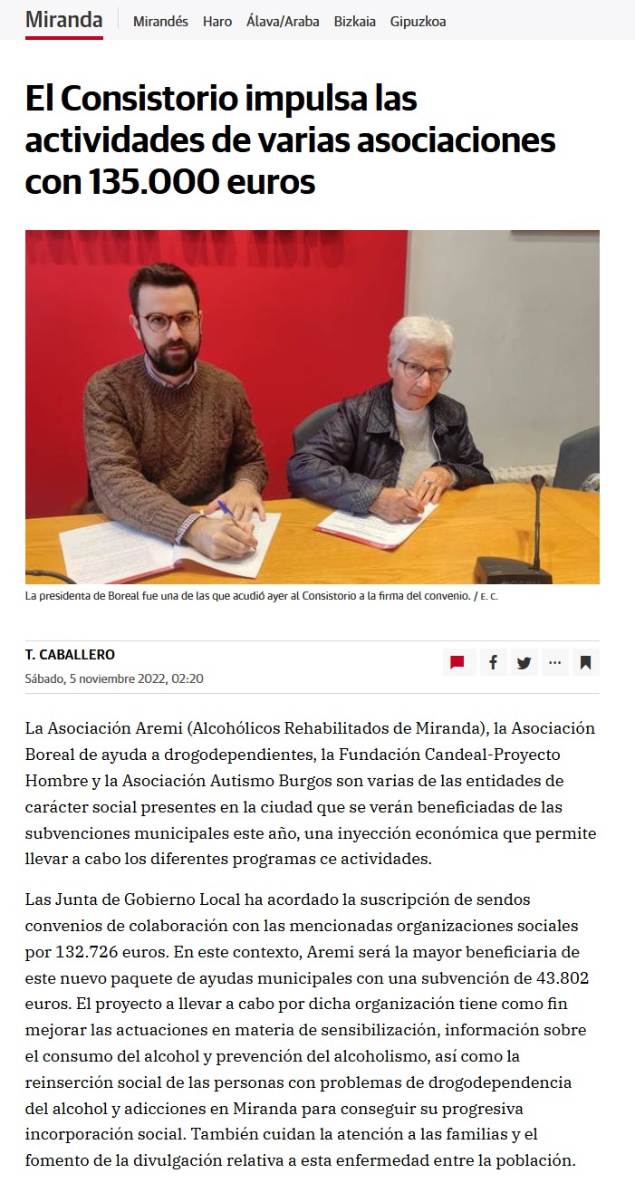 2009 Drogomedia - Aremi busca apoyo en las Redes Sociales para la Prevención 2009 El Correo - Memorial Rufino 2009 Las Drogas.info - Seminario J óvenes y Alcohol 2009 El Correo - Cuadro Artístico Mirandés - Teatro en favor de AREMI 2009 El Correo - Aremi busca el soporte de las redes sociales 2009 El Correo - V Seminario Jóvenes y Alcohol 2009 Diario de Biurgos - Seminario Jóvenes y Alcohol 2009 El Correo - Memorial Rufino