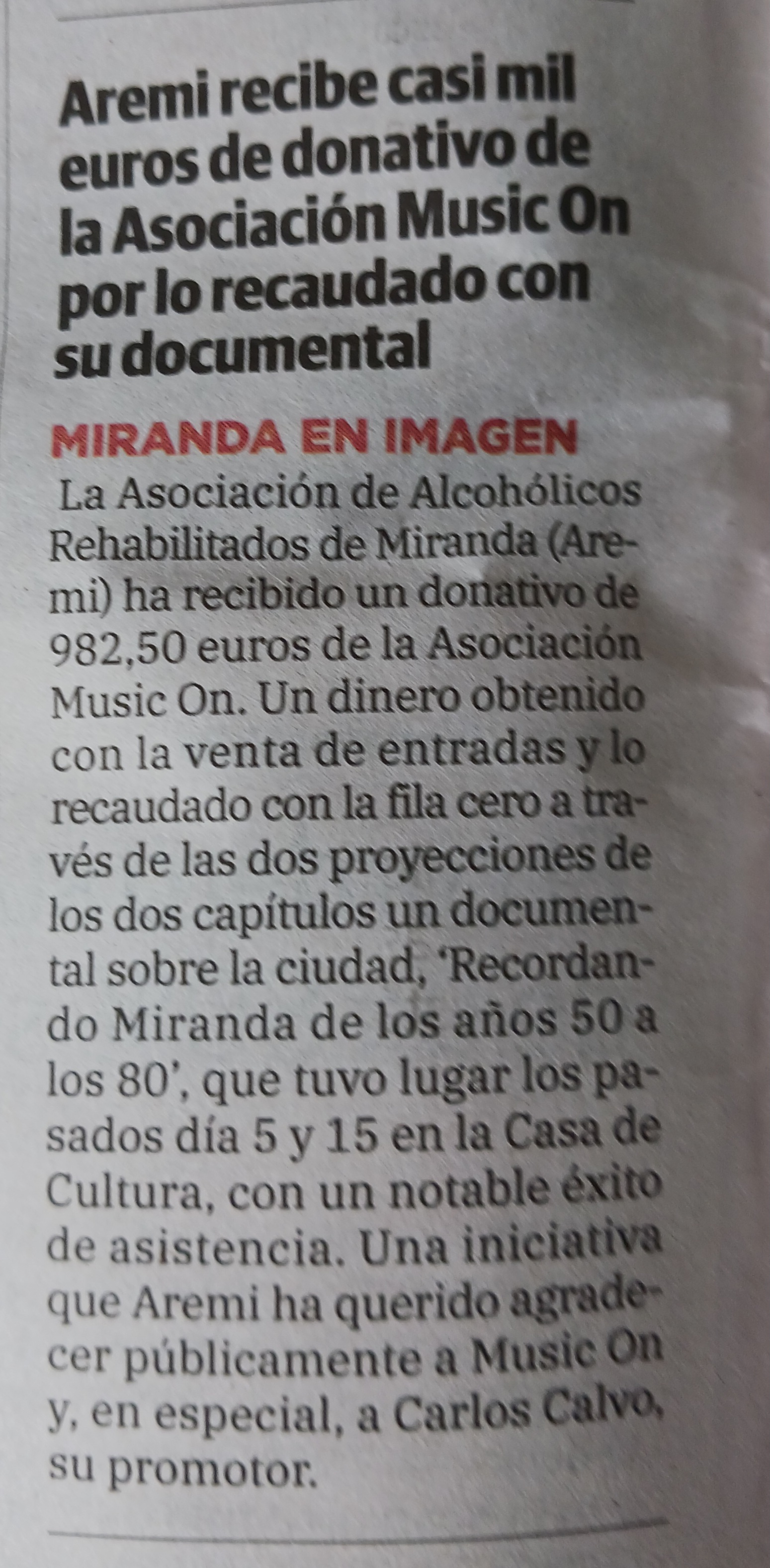 2017 - El Correo - Memorial Rufino (jpg) 2017 - El Correo - Memorial Rufino (link) 2017 - Miranda FM - Entrevista a Rafa Sánchez 2017 - El Correo - Entrevista previa a Memorial Rufino 2017 - AGENDIA (Agenda Cultural Miranda) - Reseña Memorial Rufino 2017 - ViveMiranda (Reseña AREMI) 2017 - El Correo de Burgos - Artículo sobre la Asociación (link) 2017 - El Correo de Burgos - Artículo sobre la Asociación (jpg) 2017 - Entrevista en la cadena SER (mp3) 2017 - El Correo - Artículo Tómbola Solidaria