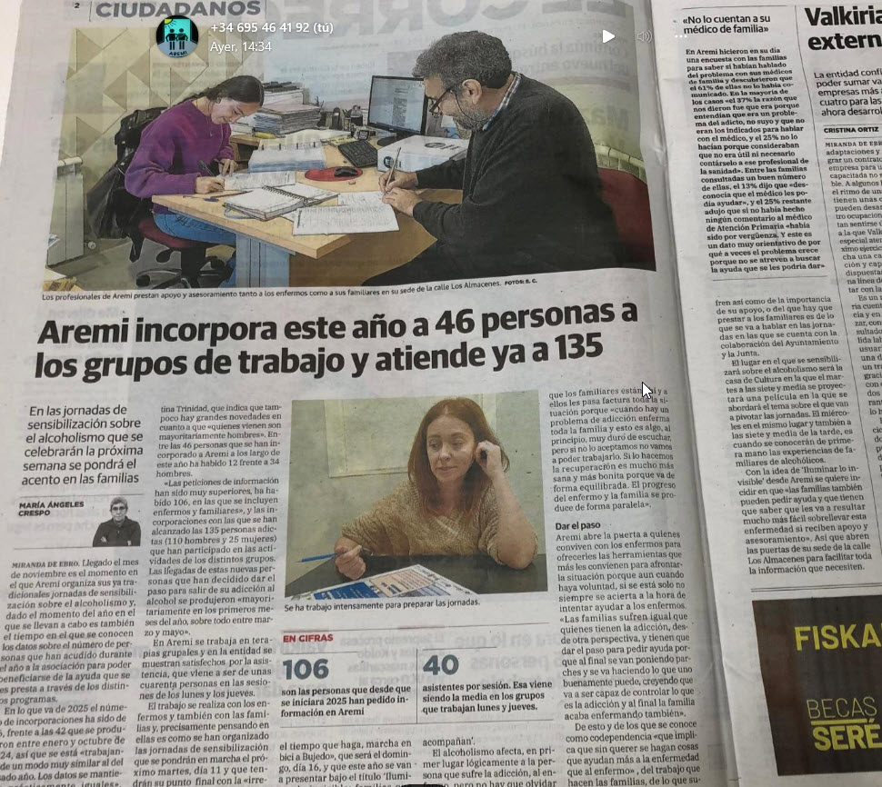 2010 Burgos-Portal - Artículo sobre AREMI 2010 - 4 y Medio Blog - Entrevista a Vanessa y Rafa (AREMI) 2010 Diario de Burgos - Entrevista Angel Velasco, Presidente de FARE, en Miranda 2010 Diario de Burgo - Entrevista a Vanessa y Rafa 2010 Diario de Burgos - VI Congreso Jóvenes y Alcohol 2010 El Correo - Dia sin alcohol 2010 El Correo - Charla en el CSM 2010 Sirimiri.net - Centro Sosiocultural de Mayores - Gota solidaria en favor de AREMI 2010 Sirimiri.net - Los Mayores colaboran con AREMI 2010 Diario de Burgos - Aremi impulsa la creación de un grupo de autoayuda en Briviesca